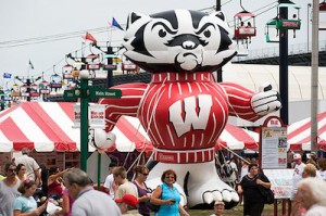 A giant inflatable version of Bucky Badger marks UW-Madison’s presence on the State Fair’s Central Mall during UW-Madison Day at the Fair, held Aug. 6, 2008, at the Wisconsin State Fair in West Allis, Wis. To highlight the important role of education and outreach, University of Wisconsin-Madison faculty, staff, student and alumni volunteers offered a variety of hands-on science demonstrations, musical performances, skills tests for sports fans, and a spirited pep rally.